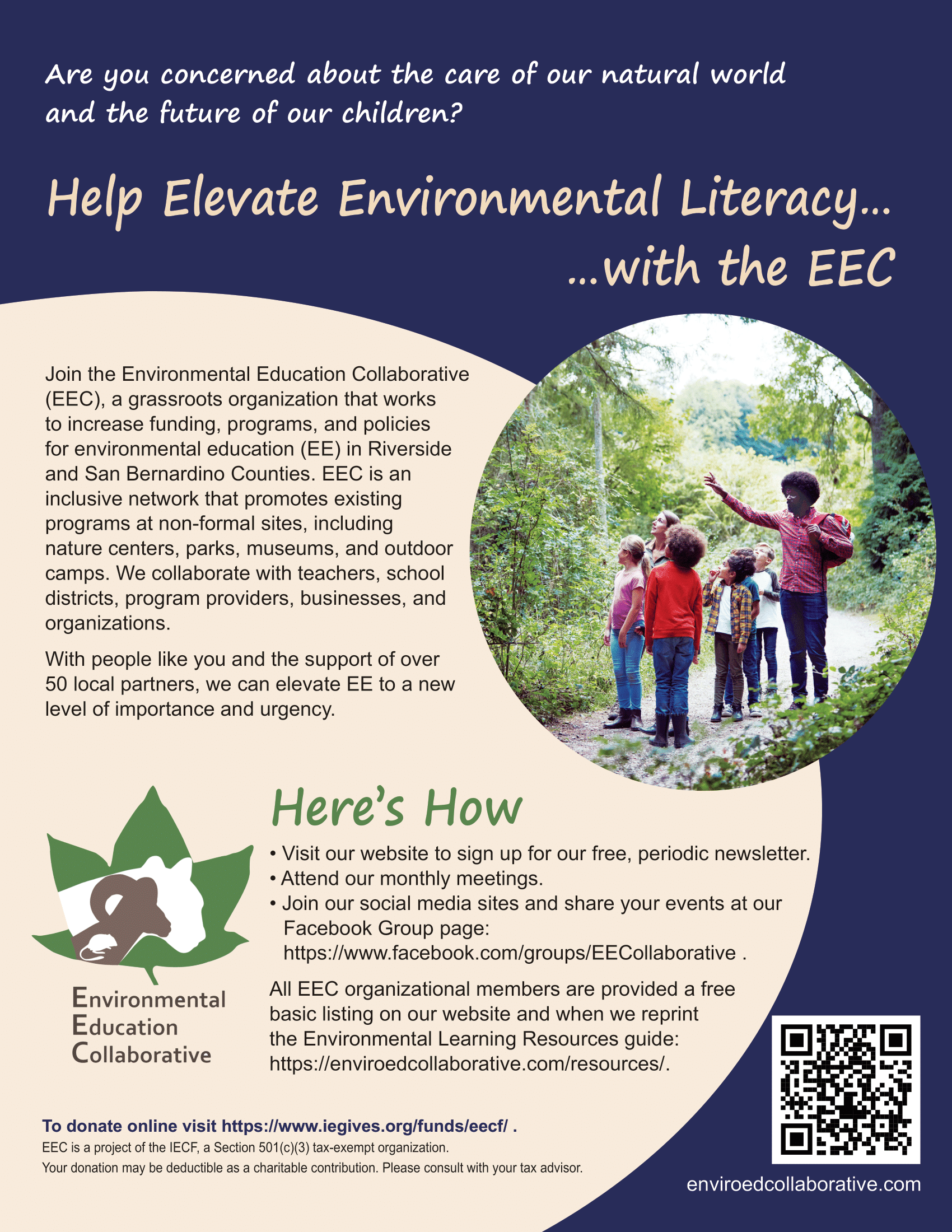 Join the Environmental Education Collaborative (EEC), a grassroots organization that works to increase funding, programs, and policies for environmental education (EE) in Riverside and San Bernardino Counties. EEC is an inclusive network that promotes existing programs at non-formal sites, including nature centers, parks, museums, and outdoor camps. We collaborate with teachers, school districts, program providers, businesses, and organizations. With people like you and the support of over